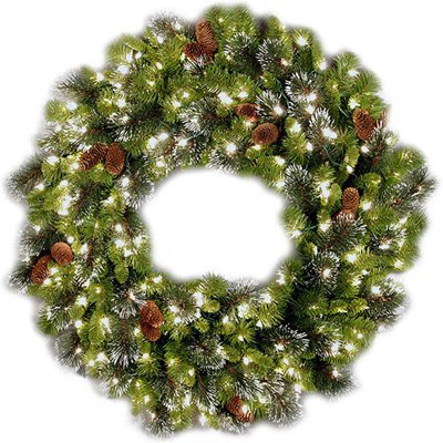 Ready for display anywhere in or outside your home, the Crestwood Spruce Christmas Wreath with cones, red berries and silver bristle will be a beautiful addition to your holiday decorations. Pre-lit with 200 clear lights, this decorative wreath glows with holiday joy.