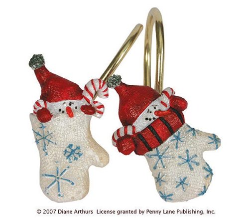 Warm Winter Wishes is what you will feel when you decorate your bath with this fun seasonal collection. A hand painted resin lotion pump and coordinating shower hooks show a snowman's smiling face peeking out of a holiday mitten. The shower curtain features the original art of Diane Arthur with a candy toss. The shower hooks are part of this collection that also includes coordinating lotion pump and shower curtain, fingertip towels, hand towels, bath towels and accent rug. All coordinating pieces are sold separately.