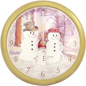 Fill your home with the joy of the season.This beautiful clock plays 12 traditional Christmas Carols, one at the top of each hour ! Brand New in gift box Measures 8" in diameter and 1" deep The face of the clock features an adorable snow family decked out in their winter finery Made of durable golden plastic with a clear plastic face Ready to hang with keyhole opening in back or use included stand to put on a mantle or table Uses 3 AA batteries (not included.) Light sensor automatically turns off sound when room is dark A lovely accent for your home during the Holiday season, at a great price