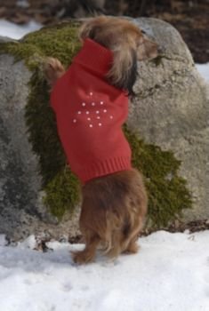 Cody's Christmas Tree Dog Sweater A Christmas sweater that is positively chic! With modern art detail and a sleek European cut, Cody's Christmas Tree dog sweater leads the fashion pack this holiday season. Features: · Great fit with room to move · Understated, rhinestone rivet tree detail · Pullover style · Fold-down turtleneck · Ribbed collar, cuffs and hem · Great on any breed · Machine wash/tumble dry low Item Specifications: Size: XSmall Small Medium Large Color: Red Materials: 100% Acrylicw