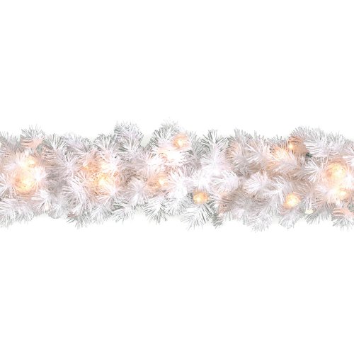 Pre-Lit White Christmas Garland. Covered with frosted White mini-lights, our pre-lit White Christmas Garland adds a touch of elegance to your festive holiday home. Our pre-lit White Christmas garland is ideal for draping on a mantel, stair banister, or close to our Pre-Lit White Christmas Tree (item 641472) and Pre-Lit White Christmas Wreath (item 641415) to form a striking holiday ensemble. Its dense foliage expands to a 10" diameter when fluffed. Generously lit with 100 Velvet Frosted White mini-lights, and if one mini-light bulb goes out, the rest stay lit. Ready to drape straight out of the box, your new 9 ft. garland will bring holiday cheer for years to come. Make your Christmas merry and decorating distinctive with our pre-lit White Christmas garland. Order yours today!